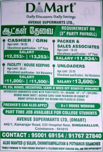 டாடா என்டர்பிரைஸ் பிக்பாஸ்கெட் – பைக் டெலிவரி பார்ட்னர்கள் தேவை! பிக்பாஸ்கெட்டுடன் டெலிவரி சேவையில் புரட்சி செய்யுங்கள் ஓட்டுநராக உங்களுக்கு ஆர்வம் உள்ளதா? இந்தியாவின் முன்னணி ஆன்லைன் கிராஸரி டெலிவரி சேவையான டாடா என்டர்பிரைஸ் பிக்பாஸ்கெட்டின் வளர்ந்து வரும் குழுவில் சேர விரும்புகிறீர்களா? இது ஒரு ஆக்கமும் முன்னோக்கும் நிறுவனத்தில் பங்காற்றுவதற்கான உங்கள் வாய்ப்பு! பதவி: டெலிவரி பார்ட்னர் (பைக்) இடம்: இந்தியா முழுவதும் நாங்கள் வழங்குவது: தேவைகள்: பிக்பாஸ்கெட்டில் ஏன்? பிக்பாஸ்கெட்டில், ஆதரவான மற்றும் சேர்க்கையான …